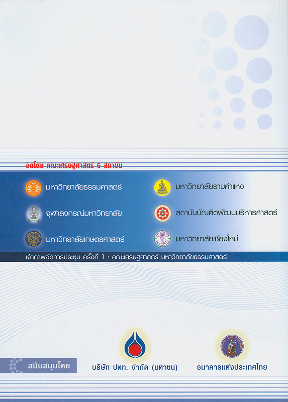 การประชุมวิชาการระดับชาติของนักเศรษฐศาสตร์. ครั้งที่ 1 28 ตุลาคม 2548 ณ หอประชุมศรีบูรพา (หอประชุมเล็ก) และ คณะเศรษฐศาสตร์มหาวิทยาลัยธรรมศาสตร์ / จัดโดยคณะกรรมการสถาบันการศึกษาด้านเศรษฐศาสตร์ 6 สถาบัน