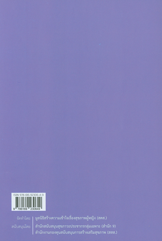 520 3 ^aหนังสือ การสำรวจข้อมูลสุขภาวะผู้หญิงกลุ่มเฉพาะ : แม่วัยรุ่น หญิงพิการหญิงมีปัญหาสถานะบุคคล หญิงบริการ และนักบวชหญิง เล่มนี้ เป็นโครงการพัฒนากลไกและแนวทาง เพื่อจัดทำฐานข้อมูลสถานการณ์และปัจจัยสังคมที่กำหนดสุขภาวะผู้หญิงกลุ่มเฉพาะ มุ่งเน้นศึกษาภาพรวมของการจัดเก็บข้อมูลของผู้หญิงกลุ่มเฉพาะ ได้แก่ กลุ่มแม่วัยรุ่น ผู้หญิงพิการ ผู้หญิงที่มีปัญหาสถานะบุคคล ผู้หญิงบริการ และนักบวชหญิง เพื่อสะท้อนให้เห็นช่องว่างที่สำคัญเกี่ยวกับสถานการณ์และปัจจัยสังคมที่กำหนดสุขภาวะของผู้หญิงเฉพาะทั้ง 5 กลุ่มนี้ โดยใช้กรอบแนวคิดหลักในการศึกษา คือ ความเป็นธรรมทางเพศ (Gender Justice) ความเสมอภาคทางเพศ(Gender Equality) และแนวคิดปัจจัยสังคมกำหนดสุขภาพ (Social Determinants of health : SDH)