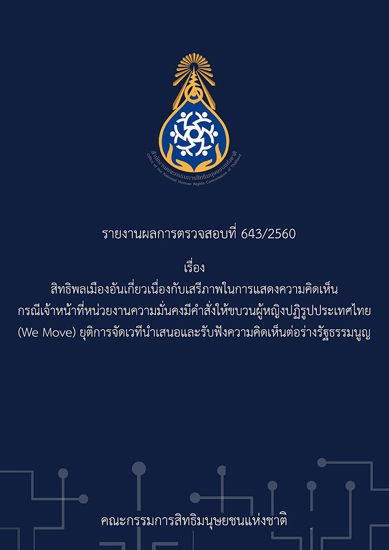 รายงานผลการตรวจสอบที่ 643/2560 สิทธิพลเมืองอันเกี่ยวเนื่องกับเสรีภาพในการแสดงความคิดเห็น กรณีเจ้าหน้าที่หน่วยงานความมั่นคงมีคำสั่งให้ขบวนผู้หญิงปฏิรูปประเทศไทย (We Move) ยุติการจัดเวทีนำเสนอและรับฟังความคิดเห็นต่อร่างรัฐธรรมนูญ / คณะกรรมการสิทธิมนุษยชนแห่งชาติ