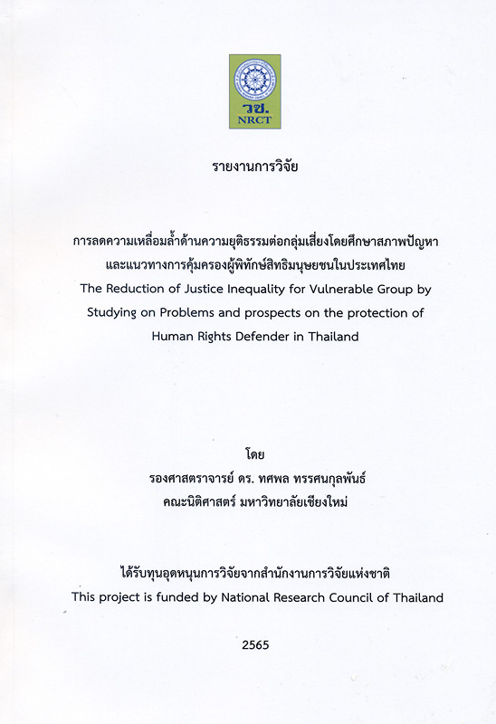 รายงานการวิจัยการลดความเหลื่อมล้ำด้านความยุติธรรมต่อกลุ่มเสี่ยงโดยศึกษาสภาพปัญหาและแนวทางการคุ้มครองผู้พิทักษ์สิทธิมนุษยชนในประเทศไทย/ ทศพล ทรรศนกุลพันธ์, นักวิจัย ; เขมชาติ ตนบุญ, เทิดภูมิ เดชอำนวยพร, ผู้ช่วยนักวิจัย