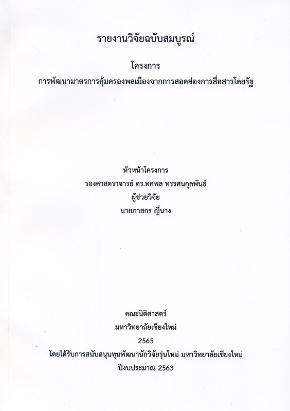 รายงานวิจัยฉบับสมบูรณ์โครงการการพัฒนามาตรการคุ้มครองพลเมืองจากการสอดส่องการสื่อสารโดยรัฐ/ ทศพล ทรรศนกุลพันธ์, นักวิจัย ; ภาสกร ญี่นาง, ผู้ช่วยนักวิจัย