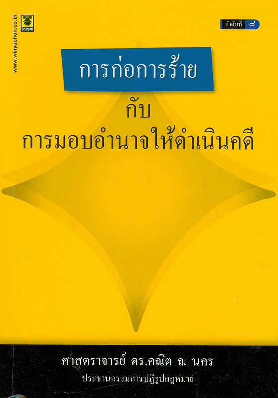 505 0 ^aการก่อการร้าย -- ^tการให้อำนาจในการดำเนินคดีอาญา -- ^tการอ่านคำพิพากษาคดียึดทรัพย์ -- ^tการเอาตัวบุคคลไว้ในอำนาจรัฐกับการปล่อยตัวชั่วคราว -- ^tความรับผิดทางอาญากับเหตุการณ์บนทางด่วนโทลเวย์ -- ^tดุลพินิจในการออกหมายจับ -- ^tนโยบายรัฐให้จดทะเบียนสำนักงานทวงหนี้ -- ^t"บุญเก่ากำลังจะหมด" ผ่านเลนส์ คณิต ณ นคร.