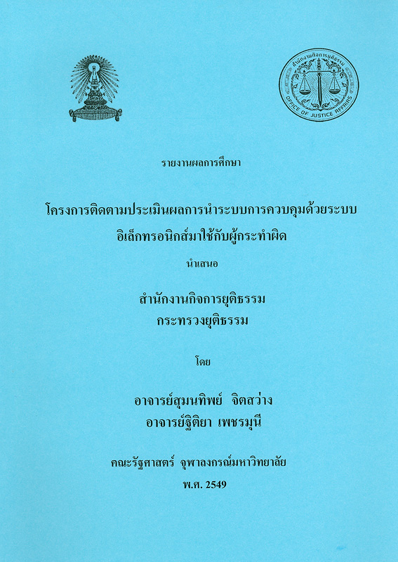 รายงานผลการศึกษาโครงการติดตามประเมินผลการนำระบบควบคุมด้วยระบบอิเล็กทรอนิกส์มาใช้กับผู้กระทำผิด/ สุมนทิพย์ จิตสว่าง และฐิติยา เพชรมุนี