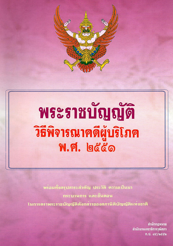 พระราชบัญญัติวิธีพิจารณาคดีผู้บริโภค พ.ศ. 2551 : พร้อมทั้งสรุปสาระสำคัญ ประวัติ ความเป็นมา กระบวนการ และขั้นตอนในการตราพระราชบัญญัติดังกล่าวของสภานิติบัญญัติแห่งชาติ / สำนักกฎหมาย สำนักงานเลขาธิการวุฒิสภา