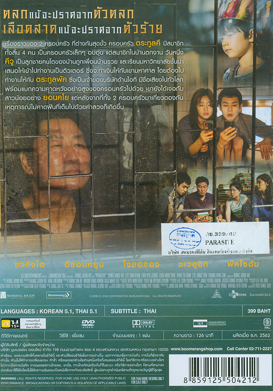 Parasite CJ Entertainment present ; a Barunson E&A production ; [produced by Bong Joon Ho, Kwak Sin Ae, Moon Yang Kwon, Jang Young Hwan] ; story and directed by Bong Joon Ho ; screenplay by Bong Joon Ho, Han Jin Won