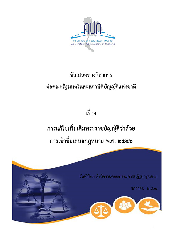 ข้อเสนอทางวิชาการต่อคณะรัฐมนตรีและสภานิติบัญญัติแห่งชาติ เรื่อง การแก้ไขเพิ่มเติมพระราชบัญญัติว่าด้วยการเข้าชื่อเสนอกฎหมาย พ.ศ. 2556 / สำนักงานคณะกรรมการปฏิรูปกฎหมาย