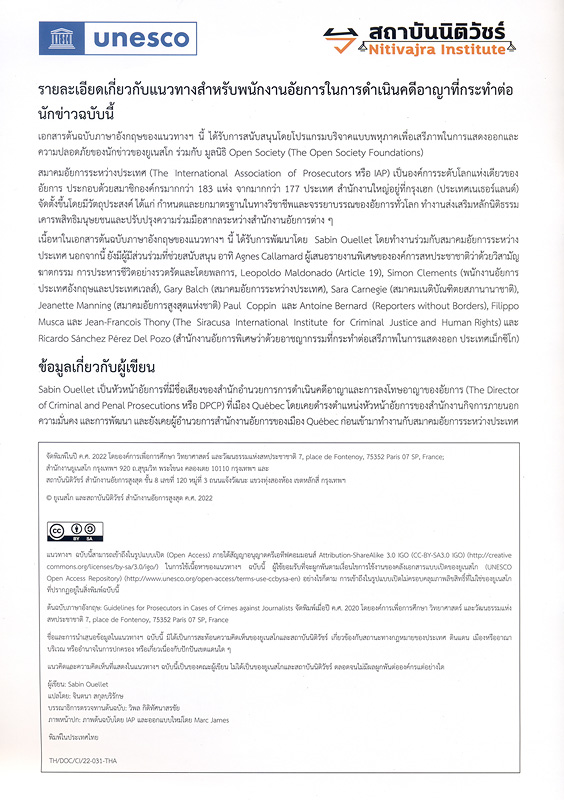 แนวทางสำหรับพนักงานอัยการในการดำเนินคดีอาญาที่กระทำต่อนักข่าว/ ซาบิน อูเลต์ม ; จินตนา สกุลบริรักษ, ผู้แปล
