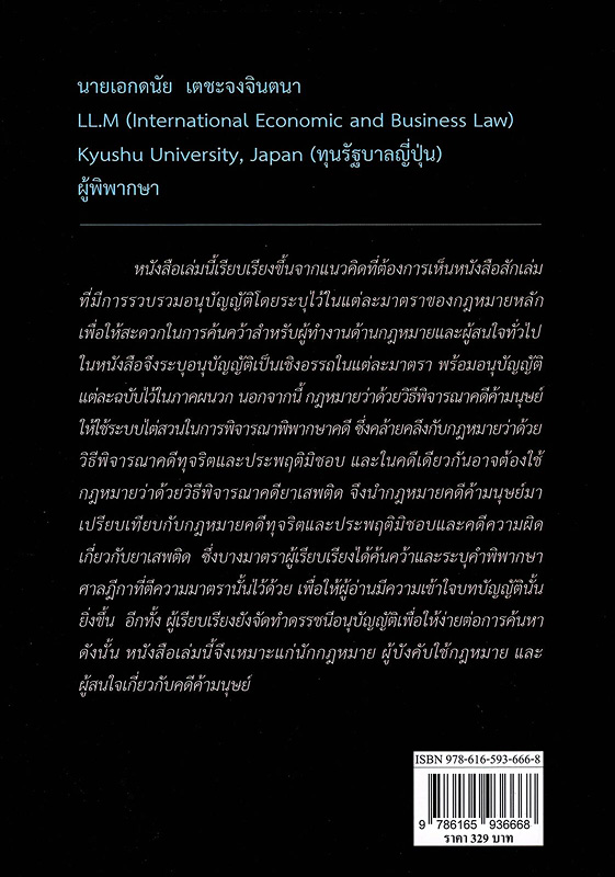 รวมกฎหมายคดีค้ามนุษย์ เปรียบเทียบคดีทุจริตและประพฤติมิชอบ และ วิธีพิจารณาคดียาเสพติด พร้อมอนุบัญญัติที่เกี่ยวข้อง/ เอกดนัย จงจินตนา