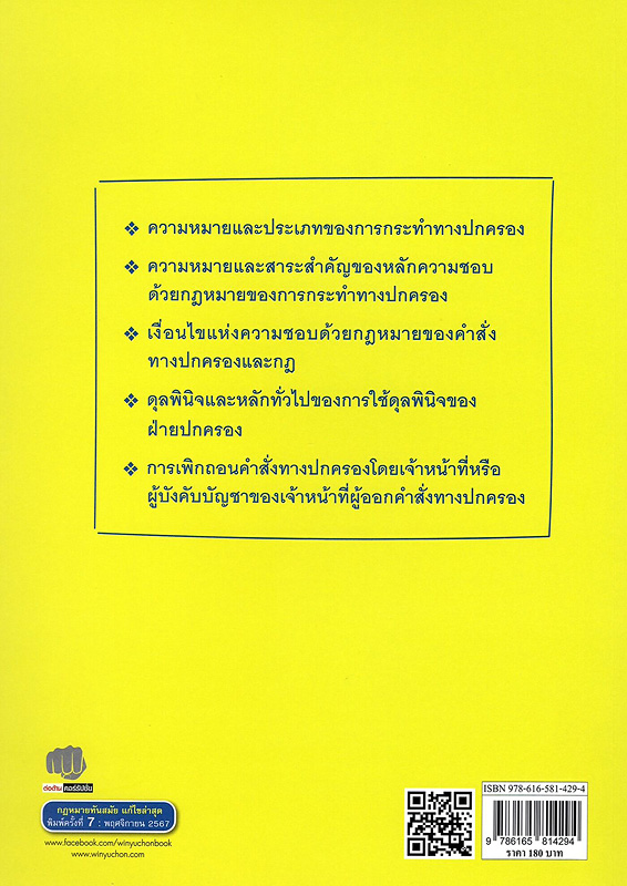 505 0 ^aบทที่ 1 ความหมายและประเภทของการกระทำทางปกครอง -- ^tบทที่ 2 ความหมายและสาระสำคัญของหลักความชอบด้วยกฎหมายของการกระทำทางปกครอง -- ^tบทที่ 3 เงื่อนไขแห่งความชอบด้วยกฎหมายของคำสั่งทางปกครองและกฎ -- ^tบทที่ 4 ดุลพินิจและหลักทั่วไปของการใช้ดุลพินิจของฝ่ายปกครอง -- ^tบทที่ 5 การเพิกถอนคำสั่งทางปกครองโดยเจ้าหน้าที่หรือผู้บังคับบัญชาของเจ้าหน้าที่ผู้ออกคำสั่งทางปกครอง