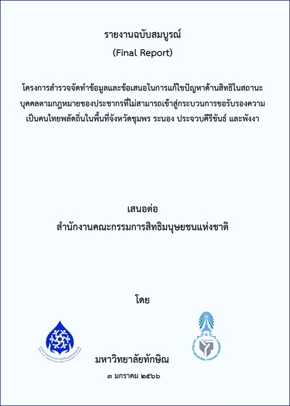 รายงานฉบับสมบูรณ์โครงการสำรวจจัดทำข้อมูลและข้อเสนอในการแก้ไขปัญหาด้านสิทธิในสถานะบุคคลตามกฎหมายของประชากรที่ไม่สามารถเข้าสู่กระบวนการขอรับรองความเป็นคนไทยพลัดถิ่นในพื้นที่จังหวัดชุมพร ระนอง ประจวบคีรีขันธุ์ และพังงา/ จัดทำโดย มหาวิทยาลัยทักษิณ ; คณะผู้วิจัย ณฐพงศ์ จิตรนิรัตน์, ภควินท์ แสงคง, วรรธิดาเมืองแก้ว, และธิดารัตน์ รัดไว้