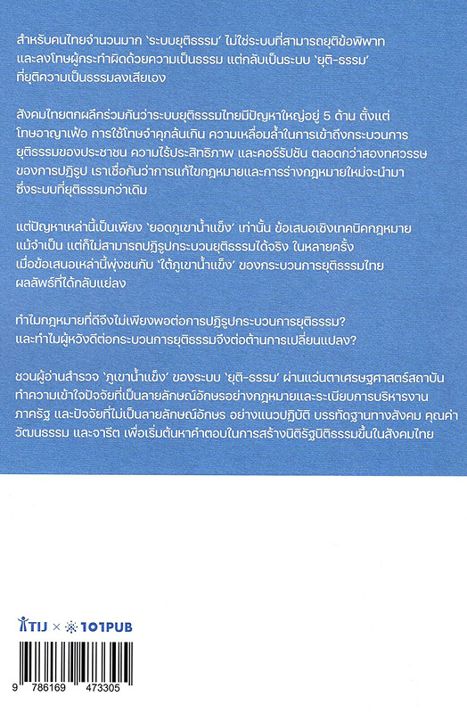 520 3 ^aสำหรับคนไทยจำนวนมาก 'ระบบยุติธรรม' ไม่ใช่ระบบที่สามารถยุติข้อพิพาทและลงโทษผู้กระทำผิดด้วยความเป็นธรรม แต่กลับเป็นระบบ 'ยุติ-ธรรม' ที่ยุติความเป็นธรรมลงเสียเอง สังคมไทยตกผลึกร่วมกันว่าระบบยุติธรรมไทยมีปัญหาใหญ่อยู่ 5 ด้าน ตั้งแต่โทษอาญาเฟ้อ การใช้โทษจำคุกล้นเกิน ความเหลื่อมล้ำในการเข้าถึงกระบวนการยุติธรรมของประชาชน ความไร้ประสิทธิภาพ และคอร์รัปชัน ตลอดกว่าสองทศวรรษของการปฏิรูป เราเชื่อกันว่าการแก้ไขกฎหมายและการร่างกฎหมายใหม่จะนำมาซึ่งระบบที่ยุติธรรมกว่าเดิม แต่ปัญหาเหล่านี้เป็นเพียง 'ยอดภูเขาน้ำแข็ง' เท่านั้น ข้อเสนอเชิงเทคนิคกฎหมาย แม้จำเป็น แต่ก็ไม่สามารถปฏิรูปกระบวนยุติธรรมได้จริง ในหลายครั้ง เมื่อข้อเสนอเหล่านี้พุ่งชนกับ 'ใต้ภูเขาน้ำแข็ง' ของกระบวนการยุติธรรมไทย ผลลัพธ์ที่ได้กลับแย่ลง ไมกฎหมายที่ดีจึงไม่เพียงพอต่อการปฏิรูปกระบวนการยุติธรรม? และทำไมผู้หวังดีต่อกระบวนการยุติธรรมจึงต่อต้านการเปลี่ยนแปลง? ชวนผู้อ่านสำรวจ 'ภูเขาน้ำแข็ง' ของระบบ 'ยุติ-ธรรม' ผ่านแว่นตาเศรษฐศาสตร์สถาบัน ทำความเข้าใจปัจจัยที่เป็นลายลักษณ์อักษรอย่างกฎหมายและระเบียบการบริหารงานภาครัฐ และปัจจัยที่ไม่เป็นลายลักษณ์อักษร อย่างแนวปฏิบัติ บรรทัดฐานทางสังคม คุณค่า วัฒนธรรม และจารีต เพื่อเริ่มต้นหาคำตอบในการสร้างนิติรัฐนิติธรรมขึ้นในสังคมไทย.