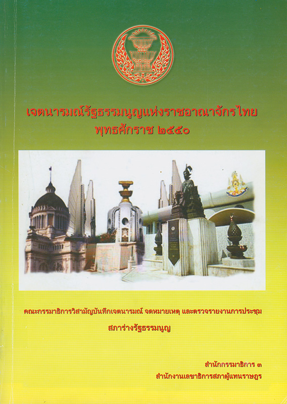 เจตนารมณ์รัฐธรรมนูญแห่งราชอาณาจักรไทย พุทธศักราช 2550 / คณะกรรมาธิการวิสามัญบันทึกเจตนารมณ์ จดหมายเหตุและตรวจรายงานการประชุม สภาร่างรัฐธรรมนูญ สำนักกรรมาธิการ 3 สำนักงานเลขาธิการสภาผู้แทนราษฎร