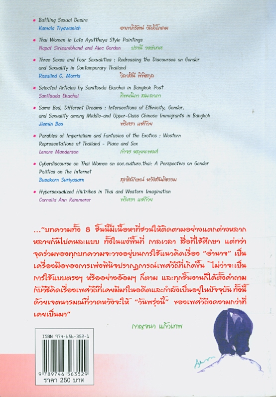 505 0 ^aเพศวิถี : วันวาน วันนี้ และวันพรุ่งนี้ ที่จะไม่เหมือนเดิม --^tสั้นๆ เกี่ยวกับเพศวิถีจากมุมมองสตรีนิยม --^tมองอดีตที่ถูกป้ายสี --^tผจญไฟราคะ --^tผู้หญิงไทยในจิตรกรรมสมัยอยุธยาตอนปลาย --^tสามเพศสรีระและสี่เพศวิถี : การปรับโฉมใหม่ของวาทกรรมเพศสภาพและเพศวิถีในยุคสังคมไทยร่วมสมัย --^tเข้าใจปัจจุบัน --^tความรุนแรงต่อผู้หญิงในสื่อ : รวมข้อเขียนของสนิทสุดา เอกชัย ในหนังสือพิมพ์บางกอกโพสต์ --^tฝันคนละเรื่องในเตียงเดียวกัน : ปฏิสัมพันธ์ของชาติพันธุ์เพศสภาพและมิติทางเพศ ในกลุ่มคนจีนพลัดถิ่นชนชั้นกลางและชั้นสูงในกรุงเทพฯ --^tนิทานสอนใจจากจักรวรรดินิยมและจินตนาการเกี่ยวกับแดนลี้ลับ : การสร้างภาพตัวแทนเรื่องเทศะและเพศของประเทศไทยในสายตาตะวันตก --^tวาทกรรมบนอินเตอร์เน็ต ว่าด้วยเรื่องของผู้หญิงไทย --^tชาวเขา "ดาวยั่ว" ในจินตนาการไทยและเทศ.