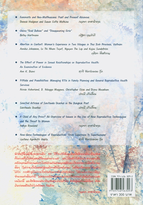 505 0 ^aสิทธิอนามัยเจริญพันธุ์ คานงัดขบวนการประชากร --^tการมาของ "เจ้าหนูมังกรทอง" กับ "การหายไปของเด็กผู้หญิง" ในประเทศจีน --^tการทำแท้งในบริบทและประสบการณ์ของหญิงชาวบ้านเวียดนาม --^tอำนาจในความสัมพันธ์ทางเพศและอนามัยเจริญพันธุ์ : บทเรียนจากประเทศในซีกโลกใต้ --^tการดูแลรักษาโรคติดเชื้อในระบบสืบพันธุ์ในบริการวางแผนครอบครัวและอนามัยเจริญพันธุ์ : หลุมพรางและทางออก --^tบทวิพากษ์ว่าด้วยประเด็นทางการทำแท้งในประเทศไทย : รวมข้อเขียนของสนิทสุดา เอกชัย ในหนังสือพิมพ์บางกอกโพสต์ --^tวิทยาการสร้าง "ลูกนอกไส้" : ผู้หญิงได้หรือเสีย --^tเทคโนโลยีพันธุกรรมใหม่สำหรับการเจริญพันธุ์ : จากอภิมหาหนูทดลองถึงอภิมนุษย์.