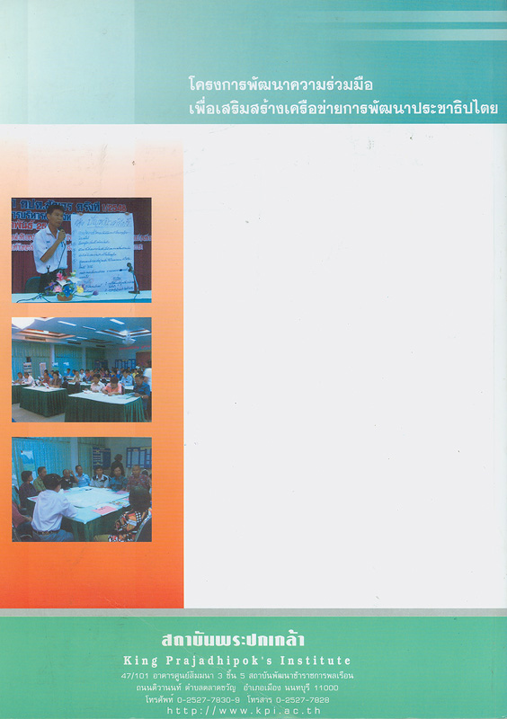 รายงานประจำปี โครงการพัฒนาความร่วมมือเพื่อเสริมสร้างเครือข่ายการพัฒนาประชาธิปไตย ประจำปีงบประมาณ 2547 / สำนักวิจัยและพัฒนา สถาบันพระปกเกล้า
