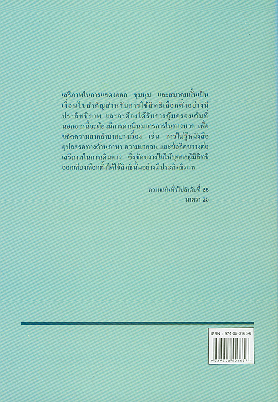 ความเห็นทั่วไปว่าด้วยสิทธิพลเมืองและสิทธิทางการเมืองที่รับรองโดยคณะกรรมการสิทธิมนุษยชนสำนักหลวงใหญ่เพื่อสิทธิมนุษยชน แห่งสหประชาชาติ / มุกดาวรรณ ศักดิ์บุญ, แปล ; วีระ สมบูรณ์, บรรณาธิการ
