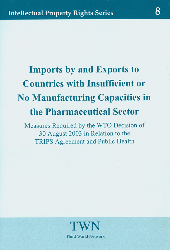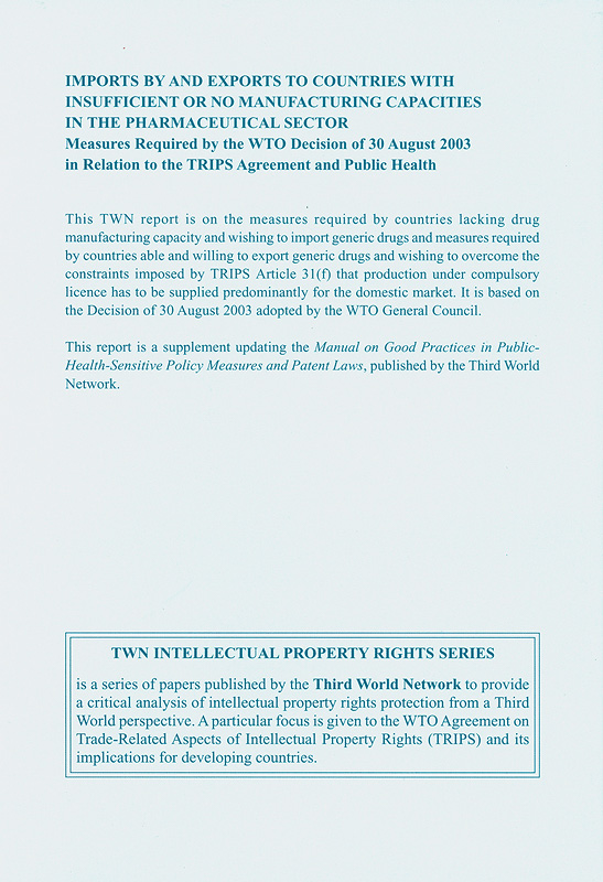 245 10^aImports by and exports to countries with insufficient or no manufacturing capacities in the pharmaceutical sector : measures required by the WTO decision of 30 August 2003 in relation to the TRIPS agreement and public health /^cThird World network