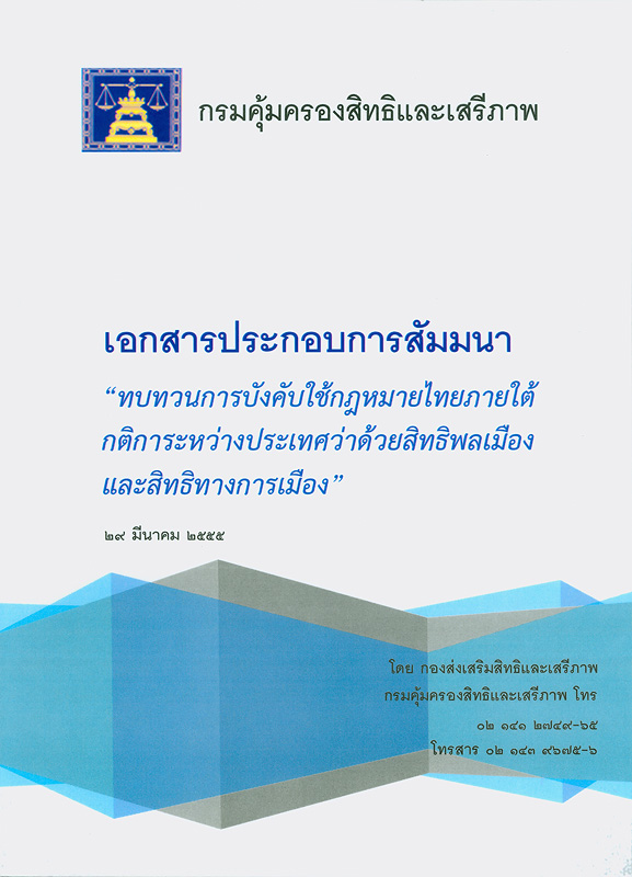 เอกสารประกอบการสัมมนา "ทบทวนการบังคับใช้กฎหมายไทยภายใต้กติการะหว่างประเทศว่าด้วยสิทธิพลเมืองและสิทธิทางการเมือง" / กองส่งเสริมสิทธิและเสรีภาพ กรมคุ้มครองสิทธิและเสรีภาพ