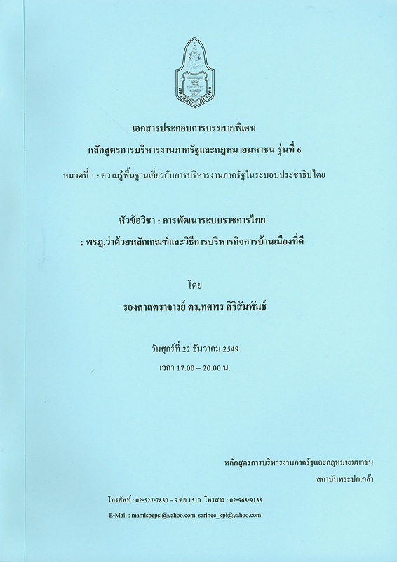 500   ^aเอกสารประกอบการบรรยายพิเศษ หลักสูตรการบริหารงานภาครัฐและกฎหมายมหาชน รุ่นที่ 6  หมวดที่ 1 : ความรู้พื้นฐานเกี่ยวกับการบริหารงานภาครัฐในระบอบประชาธิปไตย หัวข้อวิชา : การพัฒนาระบบราชการไทย : พรฎ.ว่าด้วยหลักเกณฑ์และวิธีการบริหารกิจการบ้านเมืองที่ดี วันศุกร์ที่ 22 ธันวาคม 2549 เวลา 17.00 - 20.00 น.