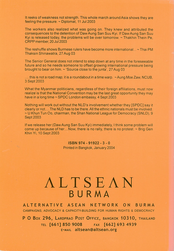 Report card Burma : 1 July - 30 Sept 2003 / Alternative Asean Network on Burma