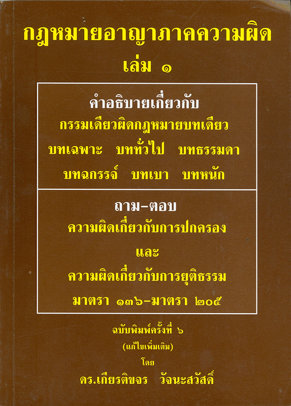505 0 ^aบทที่ 1 กรรมเดียวผิดกฎหมายบทเดียวและกรรมเดียวผิดกฎหมายหลายบท --^tบทที่ 2 หลักในประมวลกฎหมายอาญาภาค 1 (บทบัญญัติทั่วไป) --^tบทที่ 3 ความผิดเกี่ยวกับการปกครอง (มาตรา 136 ถึงมาตรา 166) และความผิดเกี่ยวกับการยุติธรรม (มาตรา 167 ถึงมาตรา 205).