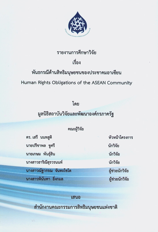 รายงานการศึกษาวิจัย เรื่อง พันธกรณีด้านสิทธิมนุษยชนของประชาคมอาเซียน / เสรี นนทสูติ, หัวหน้าโครงการวิจัย ; ปรีชาพล ชูศรี, เกษม พันธ์ุสิน, นักวิจัย