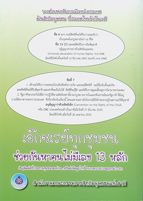 246 34^aคณะกรรมการสิทธิมนุษยชนแห่งชาติ (กสม.) ขอเสนอ เรื่องเล่าเคล้าสิทธิมนุษยชน...ว่าด้วย แนวทางปฏิบัติเมื่อพบบุคคลไร้บัตรประชาชน ไร้ทะเบียนไม่มีเลข 13 หลัก โดยใช้มาตรา 38 วรรคสอง แห่งพระราชบัญญัติการทะเบียนราษฎร ฉบับที่ 2 พ.ศ. 2551