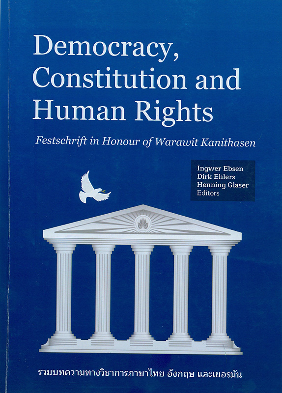 505 0 ^aCosmopolitan Lawyer, Diplomat, Humanist- Dr.Warawit Kanitasen and the CPG/^rHenning Glaser--^tการคัดเลือกและฝึกอบรมผู้ที่ได้รับการแต่งตั้งเป็นข้าราชการระดับสูงของฝรั่งเศส (Ecole Nationale d Administration หรือ ENA) [Selection and Training of Appointees for the Senior Civill Service in France (Ecole Nationale d'Administration or ENA)]/^rวิษณุ วรัญญู (Vishnu Varunyou)--^tชีวิตและงานของศาสตราจารย์ ดร.อุลริช ชอยเน่อร์ (Prof. Dr.Ulrich Scheuner, 1903-1981) (Life and Work of Prof. Dr.Ulrich Scheuner)/^rบุญศรี มีวงศ์อุโฆษ (ฺBoonsri Mewongukote)--^tเราเข้าใจตะวันตกแค่ไหน (How well do we Understand the West?)/^rส. ศิวรักษ์ (Sulak Sivaraksa)--^tปฏิวัติฝรั่งเศส 1789:จาการกำเนิดขึ้นของสภาแห่งชาติจนถึงการจัดทำคำประกาศสิทธิมนุษยชนและพลเมือง (The French Revolution: From the Establishment of the Nationnal Convention to the Making of the Declaration of the Rights of Man and Citizen)/^rปิยบุตร แสงกนกกุล--^tสังคมที่เป็นประชาธิปไตย: คุณค่า ความหวัง (Democratic Society: Values and Hope)/^rวรรณภา ติระสังขะ (Vannapar Tirasangka)--^tข้อพิจารณาโดยสังเขปเกี่ยวกับการเกิดขึ้นของรัฐธรรมนูญ และรัฐธรรมนูญในบริบทของการเปลี่ยนแปลงการปกครอง 24 มิถุนายน 2475 (Brief Remarks on the Constitution Making and the Constitution in the Context of the 1932 Revolution)/^rวรเจตน์ ภาคีรัตน์ (Worachet Pakeerut)--^tการจัดทำรัฐธรรมนูญในศตวรรษที่ 21: ความชอบธรรมเชิงกระบวนการกับสิทธิมนการมีส่วนร่วมของประชาชน (Constitution Making in the 21st Century: Procedural Legitimacy and the People's Right to Particpate)/^rปูนเทพ ศิรินุพงศ์ (Poonthep Sirinupong)--^tมอง "เค้าโครงการเศรษฐกิจ" และ "จากครรภ์มารดาสู่เชิงตะกอน" ในปัจจุบัน (Loking the "The Economic Plan": "From Womb to Tomb" in Contemporary Times)/^rอิสริยา นิติทัณฑ์ประภาศ บุญญะศิริ (Issariya Nitithanprapas Bunyasiri)--^t"สันติประชาธรรม" อุดมการณ์ของอาจารย์ป๋วย (The "Santi Pracha Dhamma" Ideology of Prof. Puey)/^rกษิดิศ อนันทนาธร (Kasidit Ananthanathon)--^tผู้หญิง ความยุติธรรม และความทรงจำบาดแผล (Women, Justice and the Memory of Wounds)/^rอังคณา นีละไพจิตร (Angkhana Neelapaijit)--^tเราจะต่อต้านเผด็จการอย่างไร (ภาคต่อ) [How do we Withstand a Dictatorship? (Prequel)]/^rเอกชัย ิไชยนุวัติ--^tพระเจ้าช้างเผือก THE KING OF THE WHITE ELEPHANT: อมตศิลป์สันติภาพ (THE KING OF THE WHITE ELEPHANT: On the Eternal Art of Peace)/^rสินธ์ุสวัสดิ์ ยอดบางเตย (Sinsawat Yodbangtoei)--^tสันติภาพแห่งเสรีไทย สู่สันติภาพในสังคมไทย (From the Peace of Free Thai Movement to Peace in Thai Society)/^rฐาปนันท์ นิพิฏฐกุล (Thapanan Nipithakul)--^tNon-Violence and Multilateral Diplomacy/^rIoan Voicu--^tAsia and the Right to Democratic Governance/^rNiels Petersen--^tDemocracy and Majority Rule/^rIngwer Ebsen--^tThe State and Religious Communities - Their Relationship and Its Development in Germany/^rDirk Ehlers--^tOn the Constitutionality of Political Parties in Germany: The Federal Constitutional Court's Innovative NPD Decision/^rLasse Schuldt--^t'People's Sector Politics' (Kanmueang Phak Prachachon) in Thailand: Problems of Democracy in Ousting Prime Minister Thaksin Shinawatra/^rMichael H. Nelson--^tResistance to Military Rule in Thailand: Legal Mobilization as Brokerage Mechanism Between Rural Villagers and Urban Middle-Classes in Resisting Military Rule in Thailand/^rEugenie Merieau--^tWatchmen With and Without Arms? Some Remarks on Selected Oversight Bodies Under the 2017 Constitution/^rHenning Glaser--^tTowards an Intellectual Agenda Against Dictatorship/^rTyrell Haberkorn--^tStaat und Nation in Liang Qichaos "Erneuerung des Volkes" (State and Nation in Liang Qichao's "Renovation of the People")/^rDuc Quang Ly--^tPerspektiven der Demokratie in Mali (Prospects of Democracy in Mali)/^rSalifou Traore--^tList of Contributors