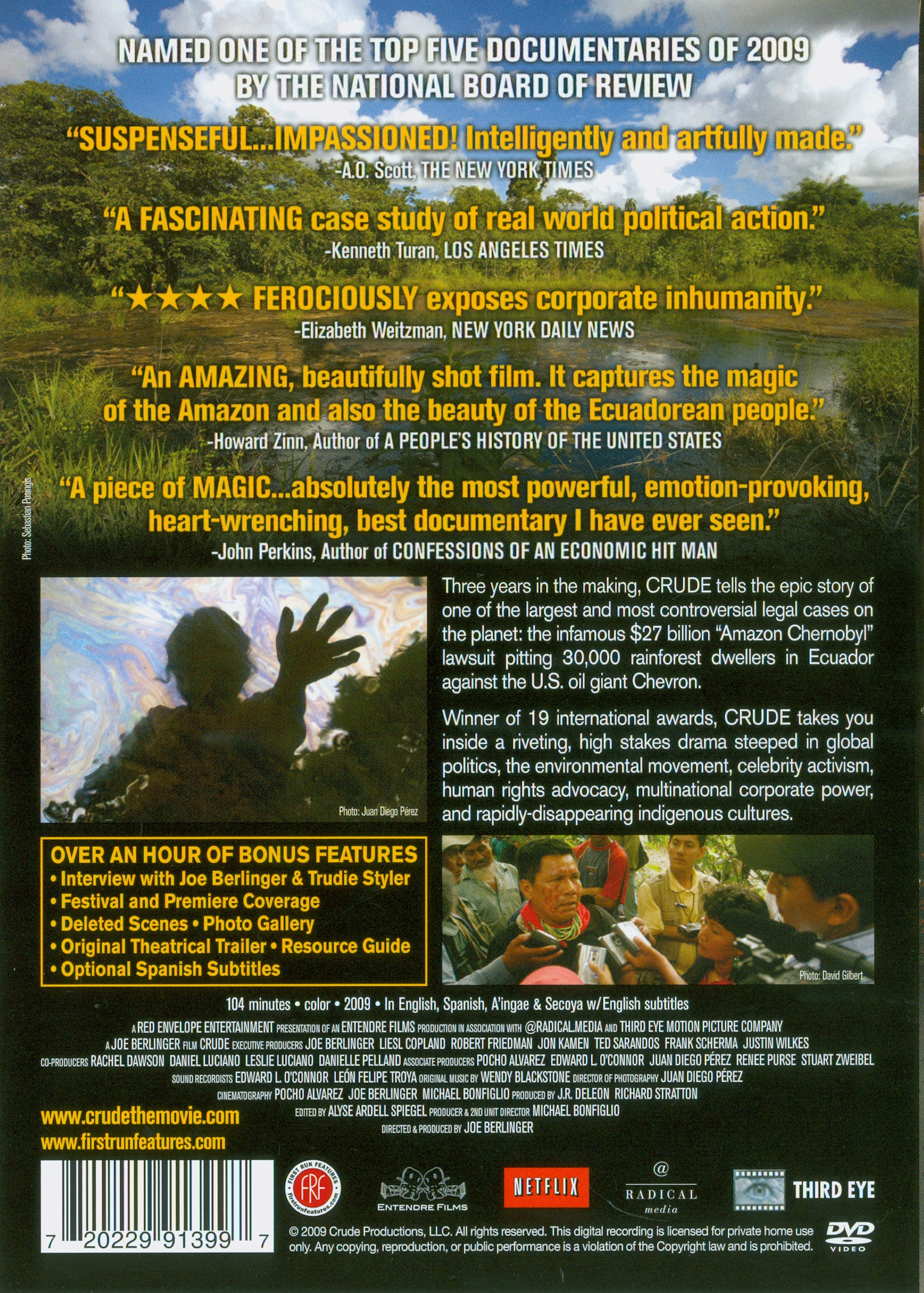 ต้นทุนที่แท้จริงของน้ำมันคืออะไร? ภาพยนตร์เรื่อง Crude เป็นสารคดียิ่งใหญ่ที่บันทึกเหตุการณ์ในปี 2007 และ 2008 เกี่ยวกับการฟ้องร้องคดี “Amazon Chernobyl” ซึ่งเรียกร้องความเสียหาย 27 พันล้านเหรียญสหรัฐฯ ต่อ Chevron Corporation ภายหลังการขุดเจาะบ่อน้ำมัน Lago Agrio โดยเนื้อหาส่วนหนึ่งกล่าวถึงเรื่องราวทางจริยธรรมเกี่ยวกับผลกระทบของสังคมที่พึ่งพาน้ำมัน และยิ่งไปกว่านั้น คือการวิเคราะห์ถึงสิ่งที่ชาวบ้าน 30,000 คนในเขตป่าดิบชื้นของประเทศเอควาดอร์ต้องแลกมา เพื่อต่อสู้กับมลภาวะที่ทิ้งไว้ให้จากการสกัดน้ำมันของบริษัท โดย Crude มองที่ประเด็นเรื่องน้ำมันจากหลายมุมมองและสถานที่หลายแห่ง ตั้งแต่ป่าดิบกลางเอควาดอร์จนถึงสำนักงานกฎหมายราคาหลายล้านดอลล่าร์ในลอสแองเจลิส